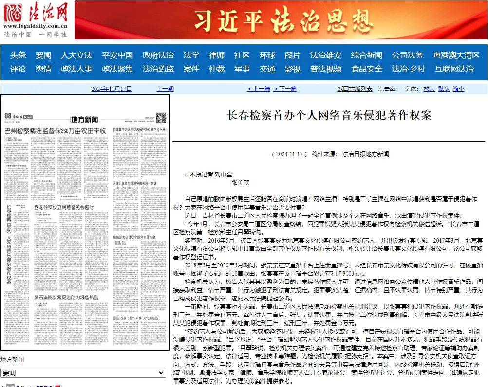 近日,吉林省长春市二道区伊莉讨论区 办理了一起全省首例涉及个人在网络音乐、歌曲演唱侵犯著作权案件。